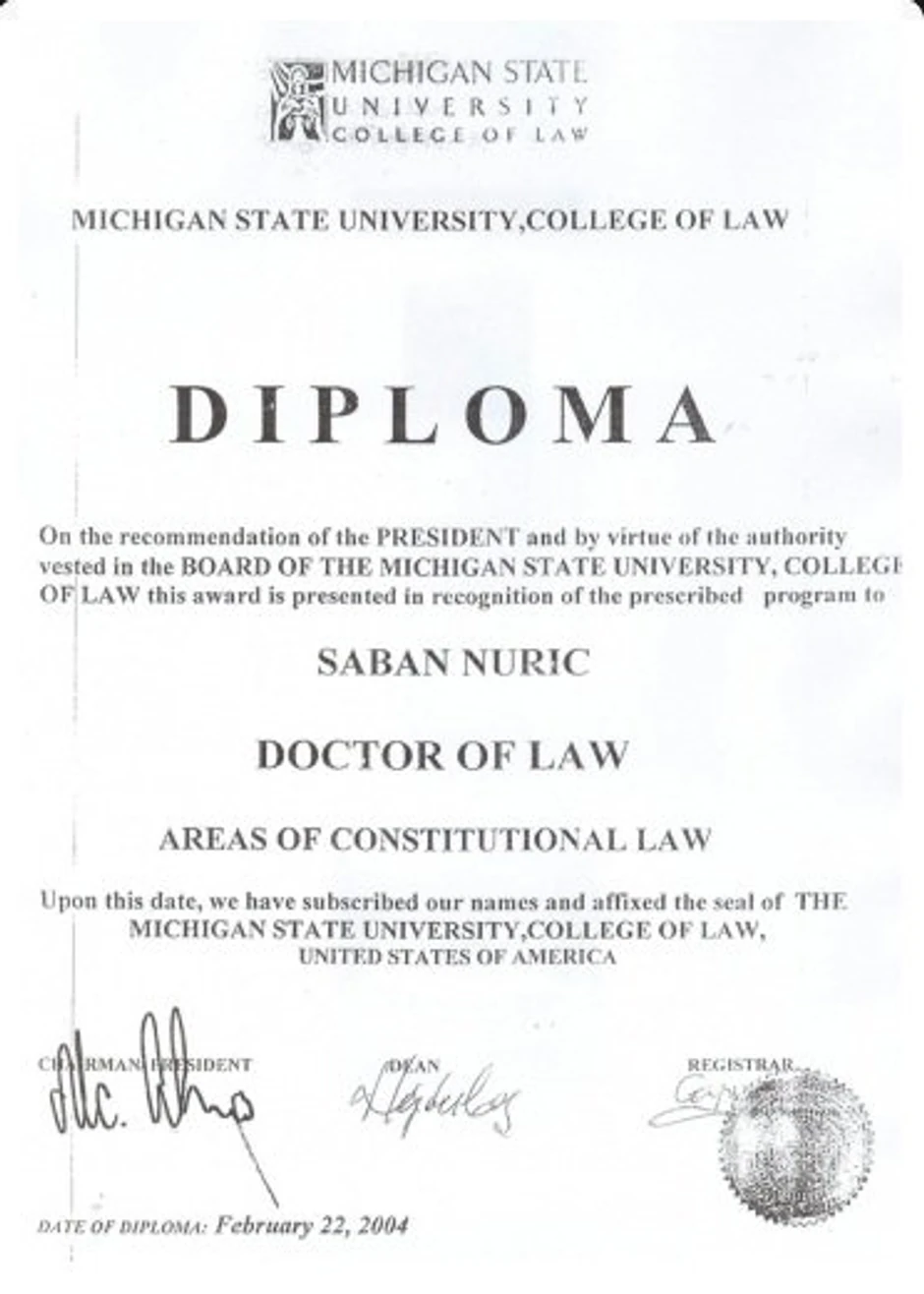 BANJALUKA - Šaban Nurić iz Gračanice uspeo je da prevari desetine privatnih univerziteta u BiH, Hrvatskoj i Srbiji na kojima predaje, iako je diploma jednog od najuglednijih američkih univerziteta Mičigen Stejt Univerziteta koju je imao - lažna.