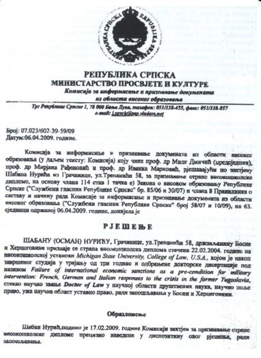 Komisija Ministarstva prosvete i kulture RS za priznavanje diploma je, prema dopisu koji je u posjedu "Nezavisnih", Nuriću diplomu priznala 17. februara 2009. godine. Na čelu Komisije bio je profesor Mile Dmičić, a članovi Komisije su profesori Mirjana Rađenović i Ivanka Marković.