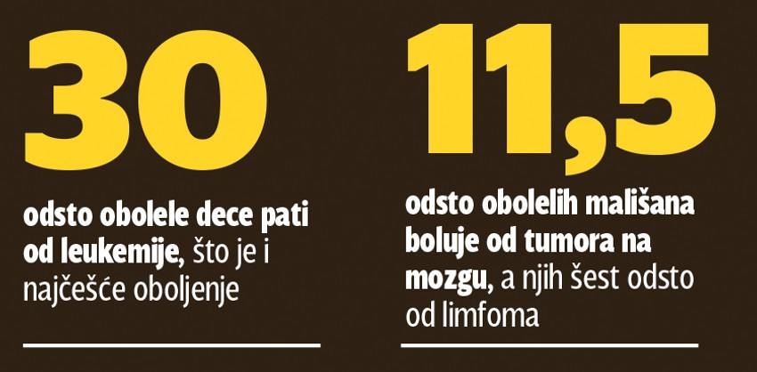 Prema podacima “Batuta”, leukemije su najčešće maligne bolesti u dečjem uzrastu, od kojih boluje 30 odsto obolele dece, slede tumori mozga sa 11,5 odsto i limfomi sa šest odsto.