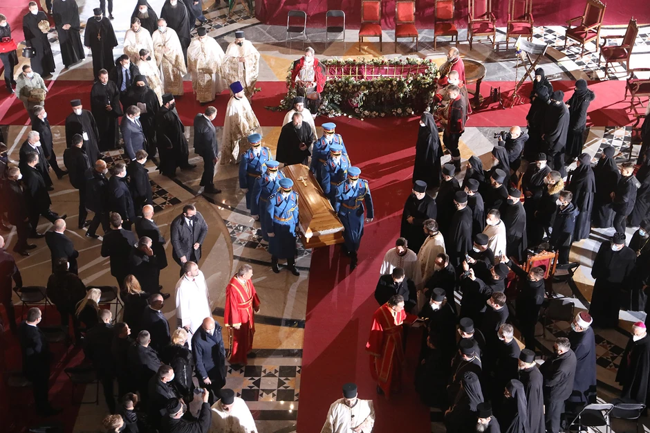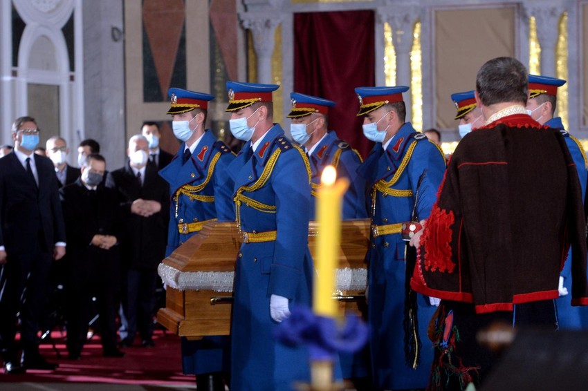 Kovčeg sa posmrtnim ostacima poglavara SPC gardisti prenose na mesto gde gde biti sahranjen. Osim njih, na samoj sahrani neće prisustvovati vernici, već sveštensvo i oni koji su učestvovali na upokojenoj liturgiji. Građani koji su se okupili u i ispred Hrama Svetog Save polako se razilaze.