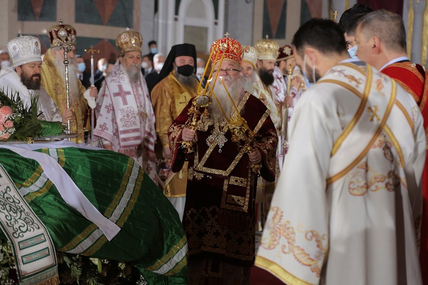Patrijarh srpski Irinej prvi je patrijarh koji je sahranjen u Hramu, koji je za njegovog života i mesta na tronu SPC završen. Arhijereji SPC su formirali kolonu, na čijem čelu je bio krst, a gardisti su poneli kovčeg sa zelenom odeždom, žezlom i panakamilavkom.