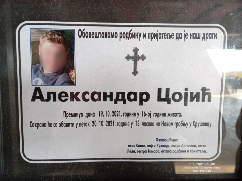 Aleksandar Cojić (16) iz Kruševca, učenik Hemijsko-tehnološke škole sahranjen je danas na Novom groblju u ovom gradu.