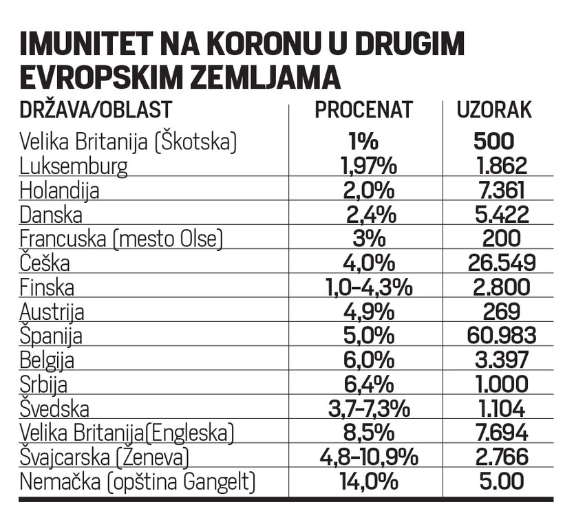 - Kod nas je rađen uzorak opšte populacije i ELISA test koji ne spada u brze serološke testove, već pokazuje prisustvo i količinu antitela. Metodološki, to je najispravnije. U Belgiji je taj procenat šest odsto, u Danskoj 2,4. U Španiji je korišćena slična metodologija kao kod nas i oni imaju prevalenciju seropozitivnosti pet procenata. U Švajcarskoj procenat populacije koja ima antitela na SARS-Cov- 2 je između 5 i 11 odsto, a koristili su isti uzorak i metodologiju kao mi - navodi prof. dr Pekmezović.