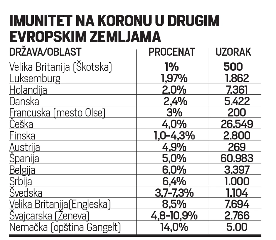 Procenat od 6,4 odsto populacije Srbije odgovara broju od oko 448.000 ljudi, što je znatno više od broja registrovanih slučajeva inficiranih koronom u Srbiji, koji iznosi 14.288. To znači da je oko 97 odsto zaraženih ostalo zvanično neregistrovano jer nisu imali nikakve manifestacije bolesti.