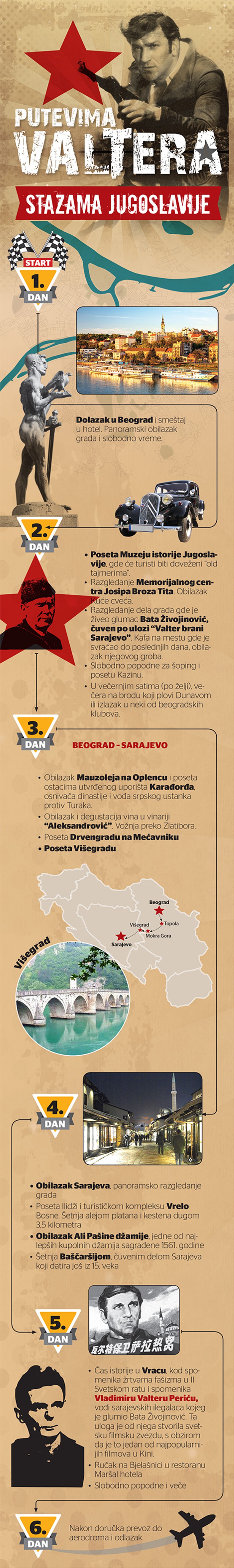 Kafić u Beogradu gde je Velimir Bata Živojinović pio kafu, mesta u BiH gde je sniman film "Valter brani Sarajevo", ali ne i Kozara i Sutjeska, rezime je specijalne turističke ture koja će u novembru biti predstavljena Kinezima, najvećim Valterovim fanovima van Balkana.