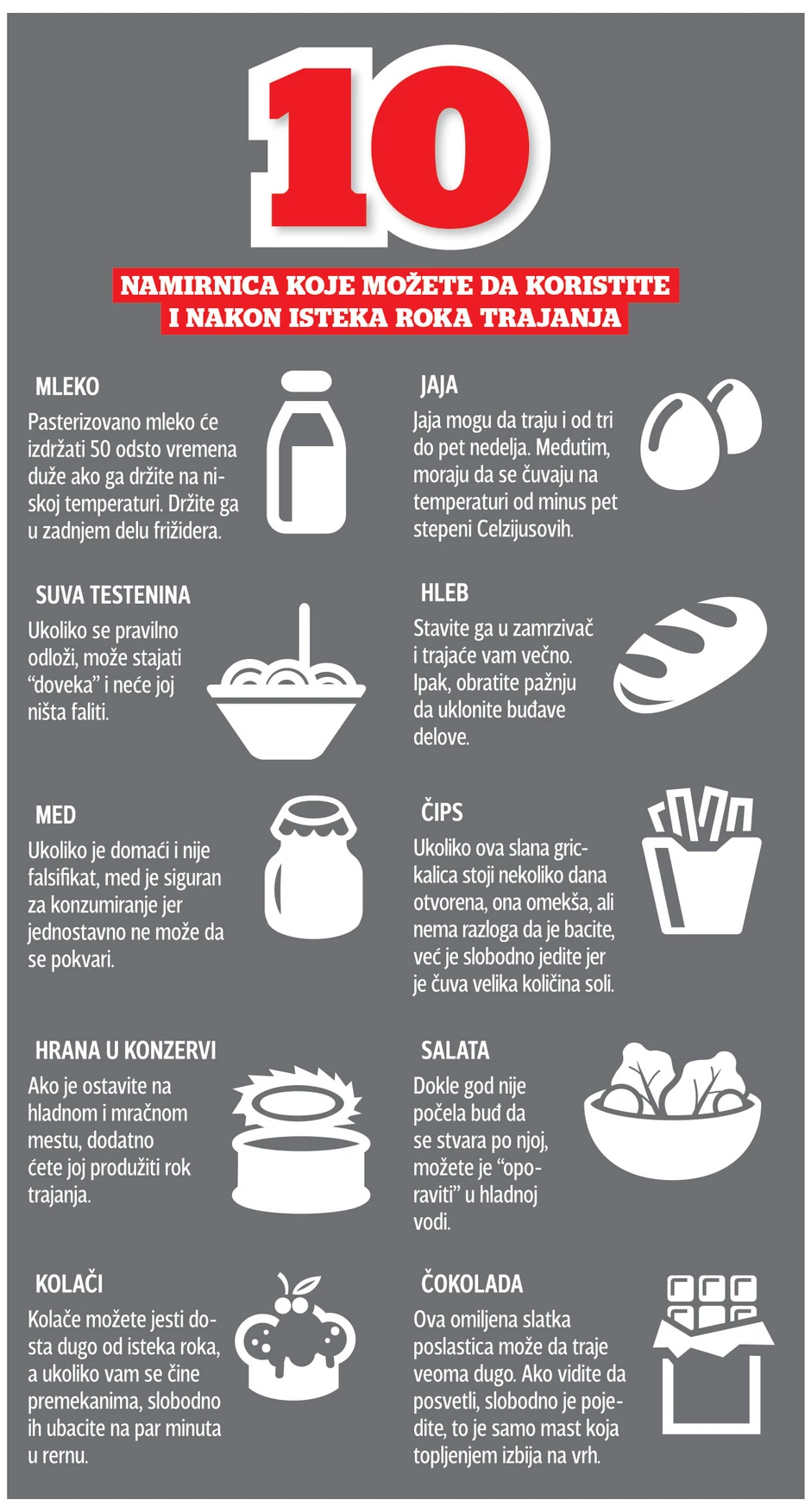 - Šećer, so, pirinač, med i sirće i mnogo posle datuma naznačenog na pakovanju mogu se koristiti, ali i za njih treba da postoji stepen opreza. Šećer jedino ne sme da bude u kontaktu sa vodom, a sirće ostaje bezbedno zbog alkoholnog vrenja. No, i kod ovih namirnica mora da se bude obazriv pri pakovanju, koje bi trebalo da bude u kesama ili platnu, dok plastiku treba izbegavati - naglašava Raičević.