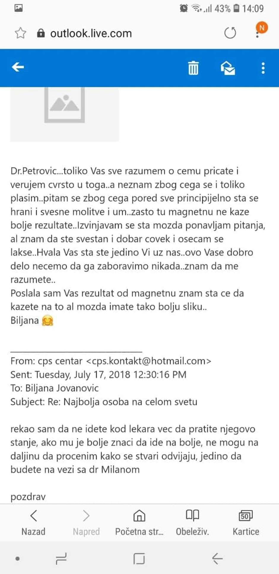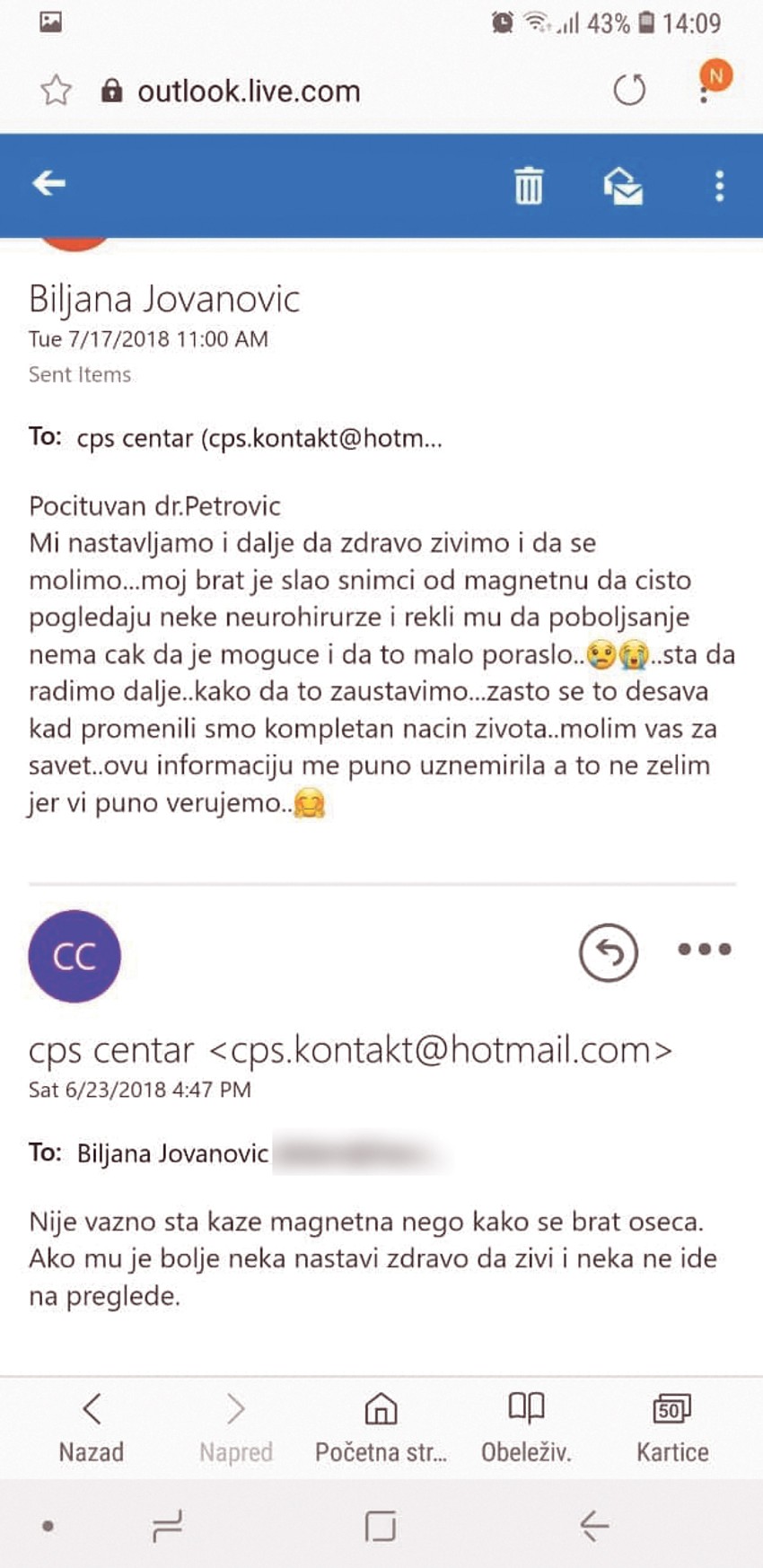 Petrović je oštro reagovao na to što su se uopšte obratili lekarima, priča Biljana, napisavši joj da se "ne bave glupostima i da im je on poslao jedinu terapiju koja može da mu pomogne", kao i da "lekove koje su mu dali lekari ne uzima", te da "nije važno šta kaže magnetna već kako se njen brat oseća".
