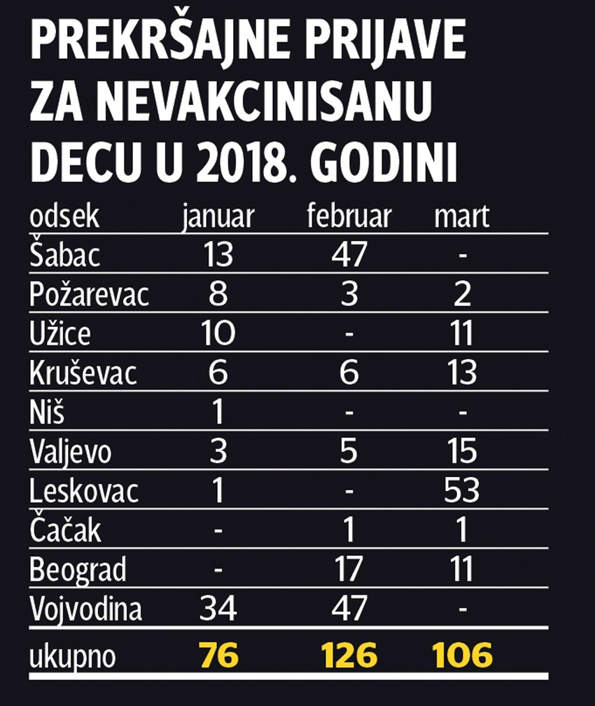 Pored njih, još nesavesnih roditelja koji uporno odbijaju da vakcinišu svoju decu MMR vakcinom uskoro će se naći pred beogradskim Prekršajnim sudom, jer je, kako „Blic“ saznaje, inspekcija Ministarstva zdravlja od početka 2018. podnela još 308 prekršajnih prijava.