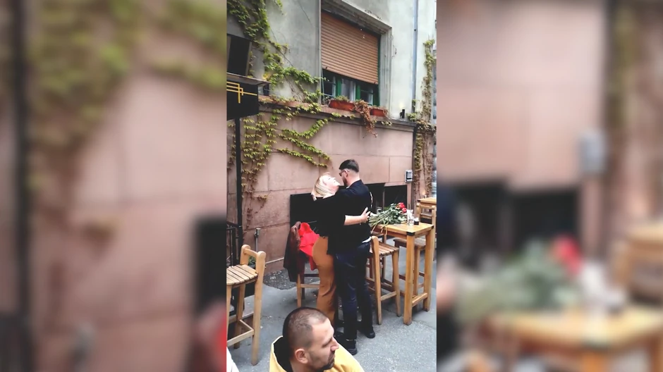 Naime, devojka je sedela za stolom na terasi poznatog kafića i pila kafu kada su odjednom počeli da joj prilaze ljudi i ostavljaju na stolu po ružu. Prelepi buket ruža krasio je njen sto i ona još uvek nije znala o čemu se radi dok nije ugledala njega. Sugrađani koji su učestvovali u ovom iznenađenju su stali sa strane, a njoj je prišao muškarac, kleknuo pred nju i zaprosio je. Usledio je zagrljaj. Na video snimku se ne čuje šta joj je rekao, ali njeni pokreti glavom, iznenađujući izraz lica, širok osmeh i neopisiva sreća na licu sve objašnjavaju. Njihovu sreću i trenutak za pamćenje učesnici koji su pomogli da se sve odigra kako je zamišljeno ispratili su gromoglasnim apaluzom i uzvicima sreće!