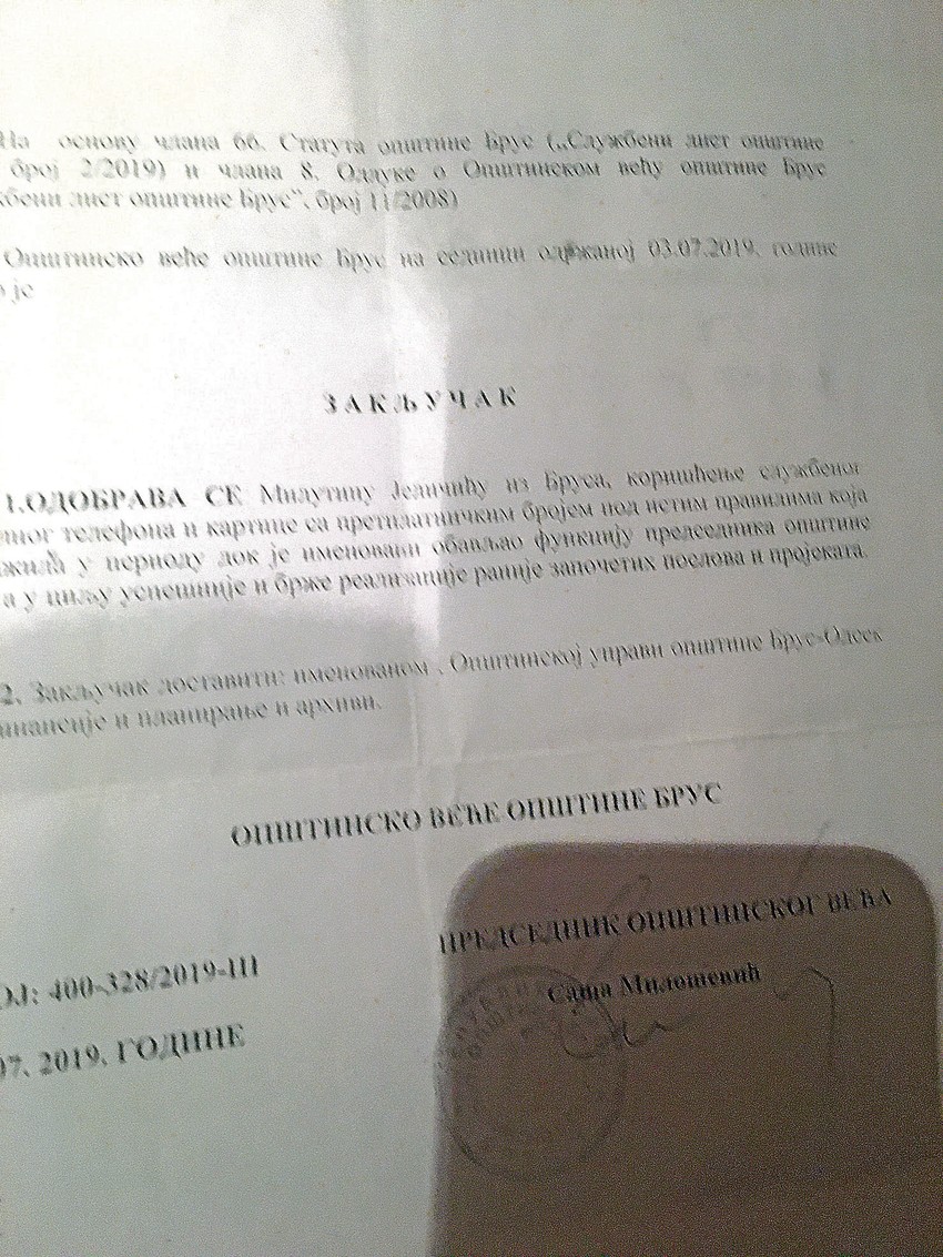 "Blic" je hteo da dobije potvrdu svojih saznanja i od nadležnih iz SO Brus. Mi smo im 30. oktobra mejlom postavili sledeća pitanja: Da li je i dalje na snazi zaključak o korišćenju službenog telefona i plaćanju računa za njih za Milutina Jelačića? Zašto je Opštinsko veće 3. jula 2019. godine donelo zaključak po kome se Jutki, i nakon odlaska sa funkcije i pod istim uslovima koji su važila i dok je bio na mestu predsednika SO Brus, plaća račun iz opštinskog budžeta? Koliki je iznos koji mu je dozvoljen da na teret opštine Brus koristi službeni telefon?