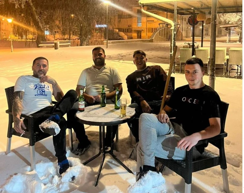 Naime, grupa mladića, fotografisala se noćas u bašti jednog lokala. I ništa tu ne bi bilo neuobičajeno da momci nisu u majicama kratkih rukava, okruženi snežnom idilom.