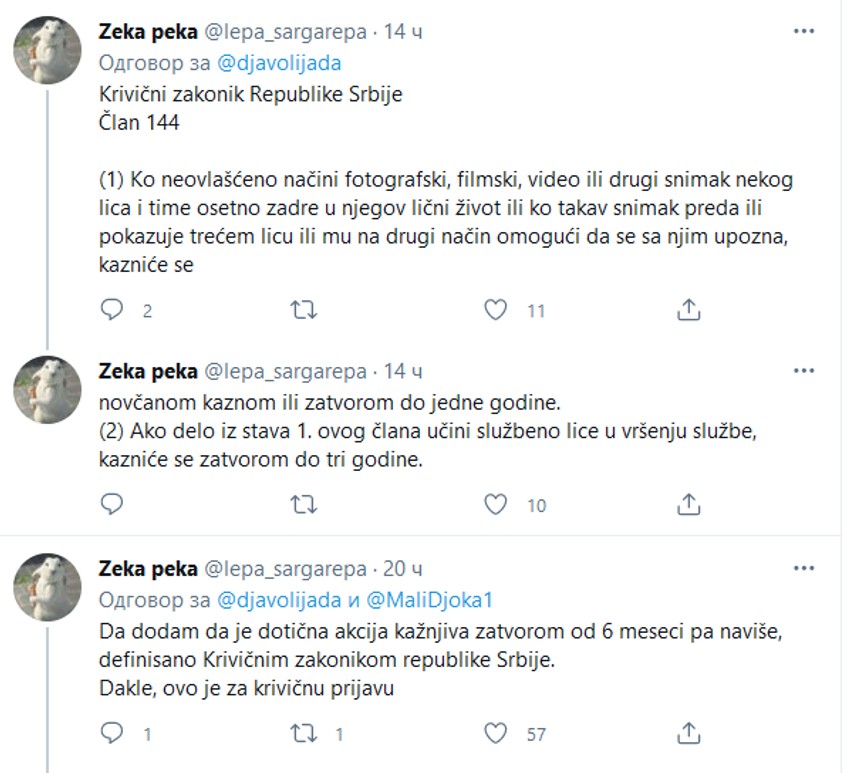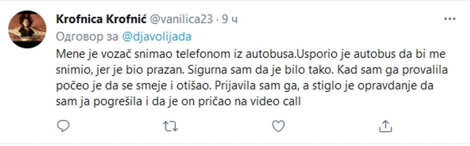 - Želim da izvršim prijavu ponašanja vozača na liniji E9 u pravcu Kumodraža, registarskih tablica BG2088RG sa vremenom događaja 12:20h. Naime, vozač je svojim privatnim telefonom slikao putnicu bez njenog znanja i pristanka. Devojka je nosila suknju i prilikom izlaska iz vozila na stanici Farmaceutskog fakulteta, vozač ju je uslikao svojim telefonom - napisala je Lena u prijavi koju je objavila na tviteru.
