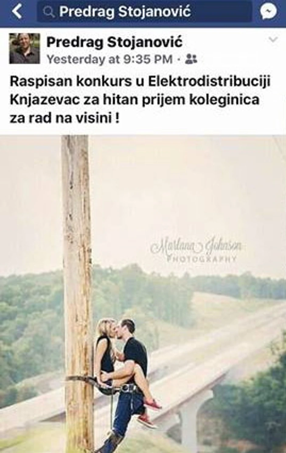 Naime, Stojanović je na svom profilu okačio fotografiju para kako na banderi vodi ljubav, uz komentar: "Raspisan konkurs u Elektrodistribuciji Knjaževac za hitan prijem koleginica za rad na visini".