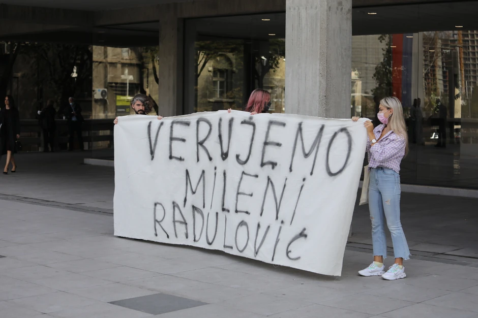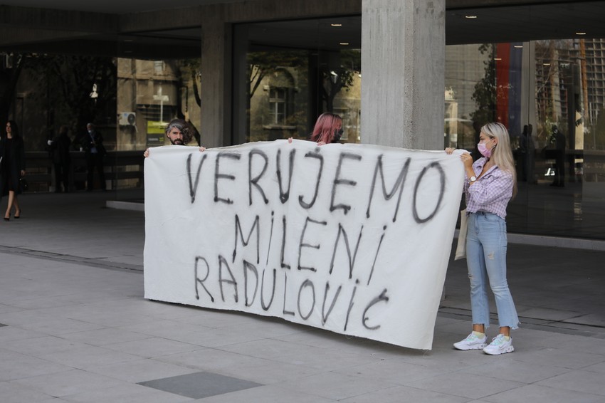 Ispred zgrade ga je sačekao transparent sa natpisom "Verujemo Mileni Radulović", glumici koja ga je prva u januaru prijavila za silovanje, kao i uzvici "silovatelj".