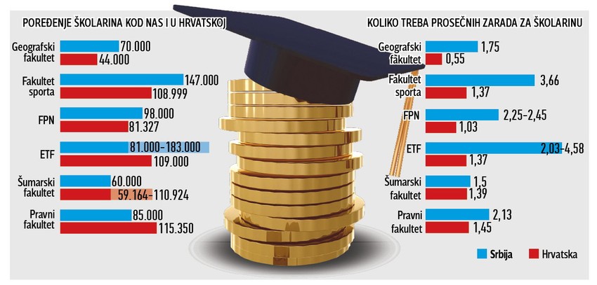 Poređenja radi, studiranje u Francuskoj na državnim fakultetima košta od 300 do 500 evra godišnje, u Nemačkoj 1.000 evra, a u Holandiji i Italiji godišnje školarine su od 1.000 do 1.500 evra.