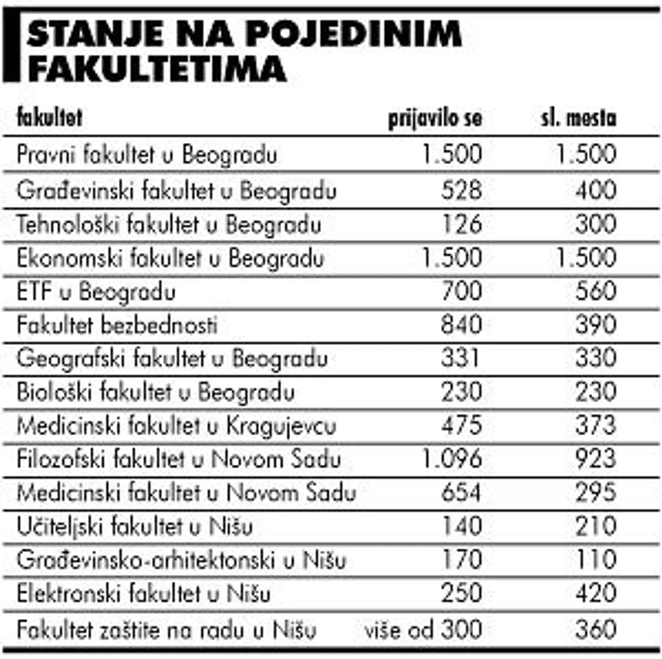 Iako na niškim visokoškolskim ustanovama kvote još nisu premašene, a odziv je bolji nego prošle godine. Brojem prijava su zadovoljni na Građevinsko–arhitektonskom i Elektronskom fakultetu.