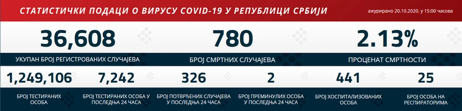 U poslednja 24 sata na korona virus u Srbiji su testirane 7.242 osobe, njih 326 bilo je pozitivno, dok su nažalost, preminula dva lica.