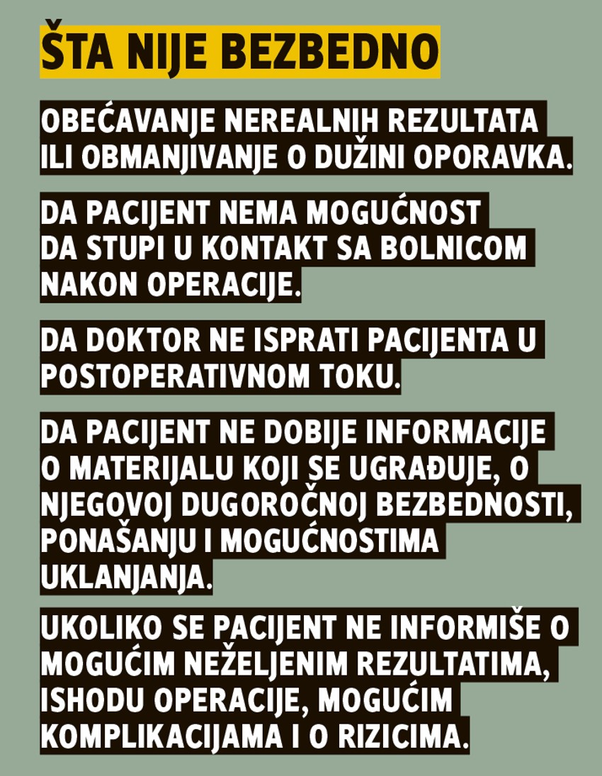 - Na primer, pacijent je dao informaciju da se dobro oseća i da je zdrav, a ima zahtev za višestrukim zahvatom. Na preoperativnoj pripremi ustanovimo da je zdrav, ali da su analize krvi granične i da bi bilo kojom intervencijom ugrozio ili pak produžio oporavak. Predlažemo da uradi jednu od željenih operacija ili da popravi svoje stanje, pa da se naknadno javi. Tu je i primer pacijenta koji je došao na ultrazvučnu liposukciju, rekao da želi da ukloni veći broj kilograma, a mi smo ustanovili bubrežne probleme, pa bi mu velika infiltracija tečnosti u masno tkivo ugrozila funkciju bubrega - navodi doktorka Ašanin.