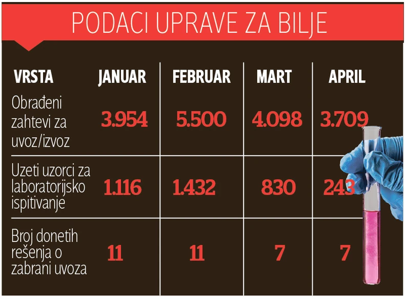 U Informatoru o radu Uprave za zaštitu bilja, u okviru koje radi Fitosanitarna inspekcija, navodi se da je tokom aprila obrađeno 3.709 zahteva za uvoz i izvoz hrane biljnog, mešovitog porekla i hrane za životinje. Od toga je na laboratorijsko ispitivanje poslato tek 243 uzorka, od kojih je u sedam slučajeva zabranjen uvoz.