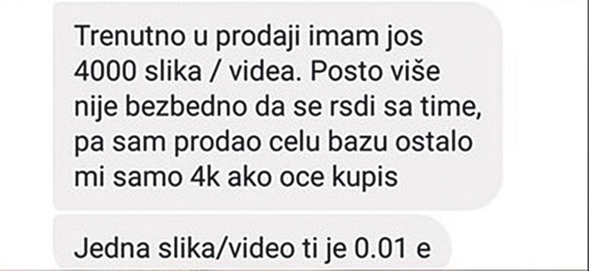 Kako tvrdi u prepisci na raspolaganju ima 4.000 fotografija i snimaka. Tviter korisnici su šokirani jer je osoba koja se predstavila kao prodavac izgleda maloletnik.