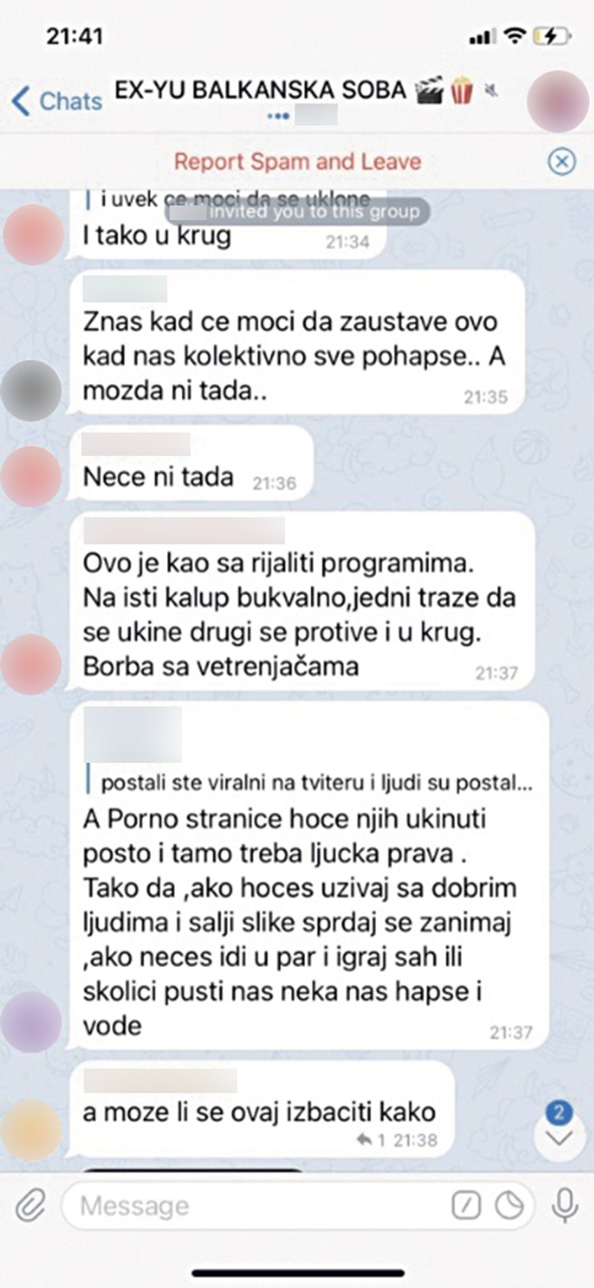 U ovu grupu sa lažnim profilom uspela je da se učlani Staša Ivković, koja je skrinšotovala jezive prepiske u kojima se vidi kako više desetina hiljada ljudi objavljuju slike i snimke žena i devojčica koje ili nisu znale da su fotografisane i snimane ili nisu dale dozvolu da se materijal objavljuje, te ih podelila ih sa javnosti na mreži Tviter.