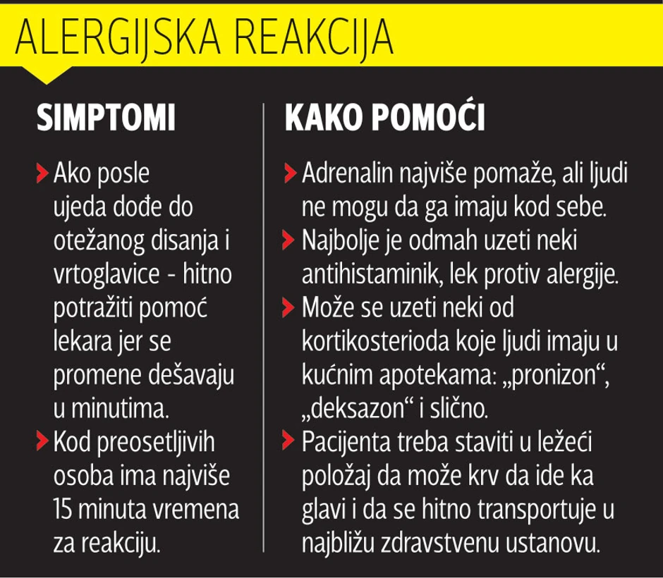 - Kod osoba koje su preosetljive na ubod insekata može doći do anafilaktičke reakcije koja se manifestuje otežanim disanjem, padom pritiska, poremećajem srčanog ritma i gubitkom svesti. Usled alergijske reakcije otiče tkivo u ždrelu i usnoj duplji, što može da onemogući disanja. Do smrti dolazi u jako malom procentu - objašnjava doc. dr Miodrag Vučić, direktor Klinike za hematologiju KC Niš.