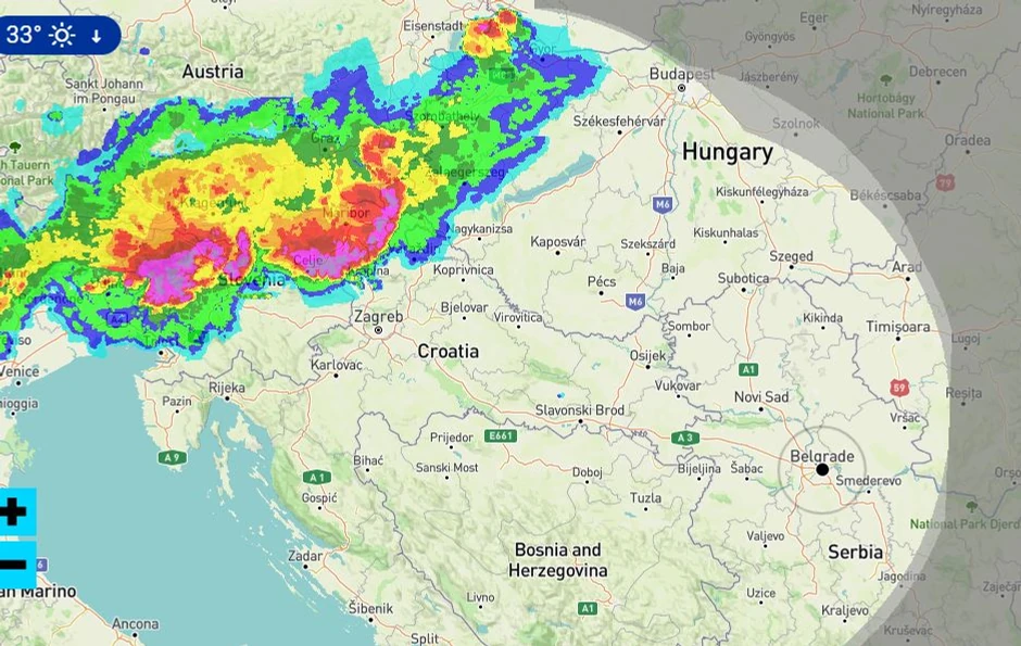 Jako grmljavinsko nevreme zahvatilo je u poslepodnevnim satima južnu Austriju i preko Slovenije premešta se prema Hrvatskoj. Prema najavama meteorologa, olujno nevreme stići će i u Srbiju, i to sutra popodne.