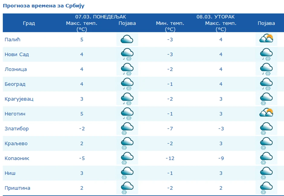 U Srbiji do 14. marta hladno vreme za prvu polovinu marta sa jutarnjim mrazevima i dnevnom temperaturom u većini mesta od 2 do 5 stepeni. U utorak oblačno, mestimično sa slabim snegom, u nižim predelima i kišom.