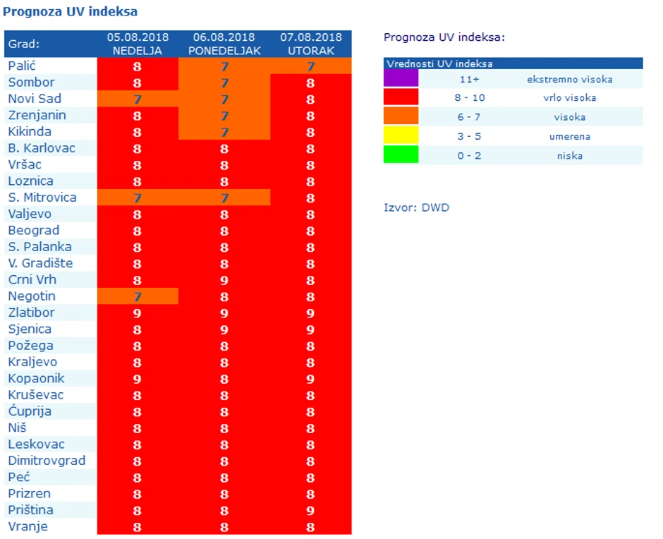 Zbog izuzetno viskoih temperatura, značajno je povišeno i UV zračenje širom zemlje. Savet koga se treba pridržavati jeste da se ne izlazi napolje bez zaštite od sunca, pogotovu u periodu od 10 do 17 sati, kada je sunce najače. Većina mesta u Srbije je u crvenom na mapi RHMZ, što znači da je reč o vrlo visokim vrednostima UV indeksa.