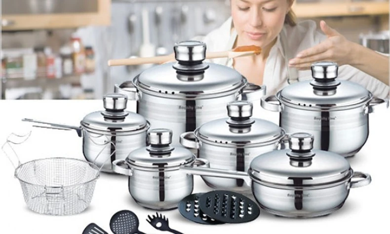 Kuvajte i uz Royalty Line posuđe koje sadrži 18 delova izrađenih od kvalitetnog nerđajućeg čelika! Set sadrži šest posuda je sa specijalnim višeslojnim dnom, koje ima svrhu ravnomernog prenosa toplote i šest poklopaca sa termostatima, metalnu fritezu, jedan tiganj, dva podmetača otporna na toplotu i tri plastične špatule, a može biti vaš za 5.999 dinara klikom na gruppi.rs.