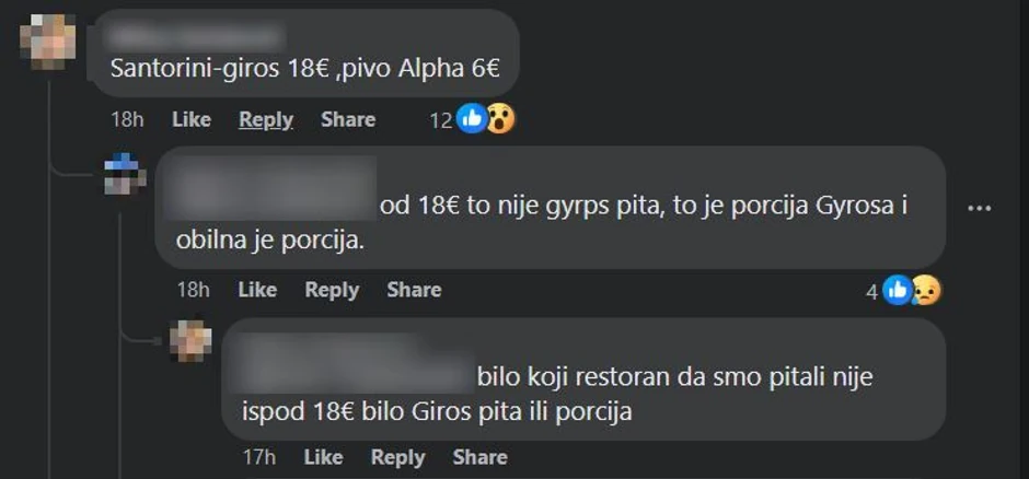 "Plaćala sam ovih dana u rasponu od 4,3 do 4,5, a onda nabasam u Skala Potamia na Tasosu za 6 evra prosečne veličine i osrednjeg kvaliteta sa malo girosa i gomilom pomfrita", "3,50 Paralija", "4,5 evra Skijatos, 3,80 evra Kala Nera", "7,5 Zakintos", "4,5 Kalitea", nizali su se odgovori u komentarima.