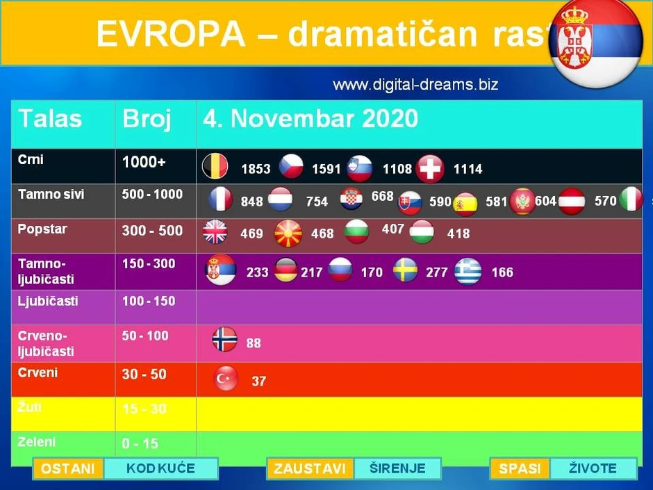 Prema podacima koje svakodnevno objavljuje prof Petar Kočović, koji pomoću matematičkih prognoza i formula prati kretanje pandemije kovida-19 u celom svetu, u Evropi nema zemlje u zelenoj ili žutoj zoni, a u najboljem položaju je Turska sa 37 zaraženih na 100.000 stanovnika i ona je u crvenoj zoni.