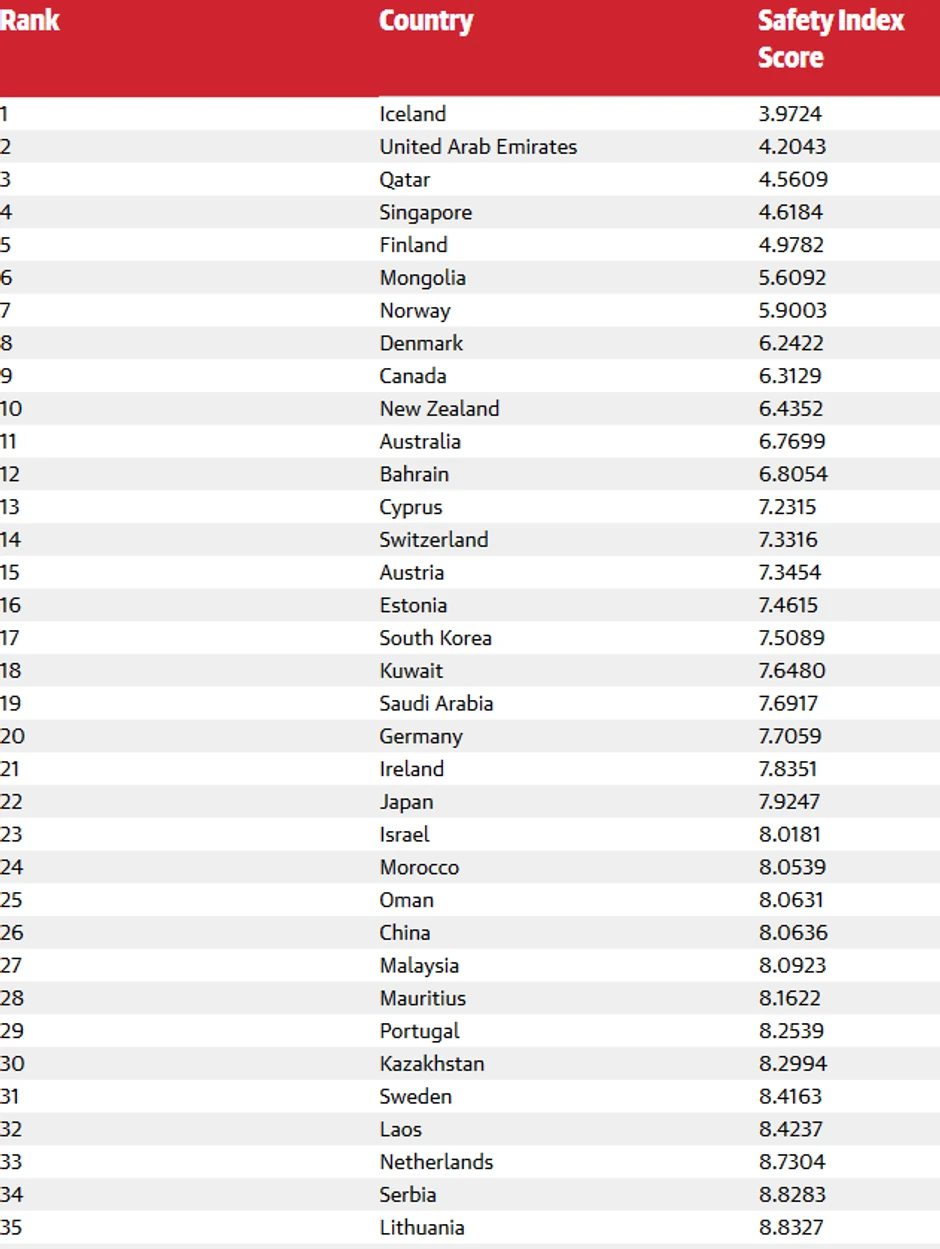 Srbija je prema svetskoj rang listi najsigurnijih zemalja sveta na 34 mestu od ukupno 134 zemlje, dok je prema toj analizi prva u regionu.