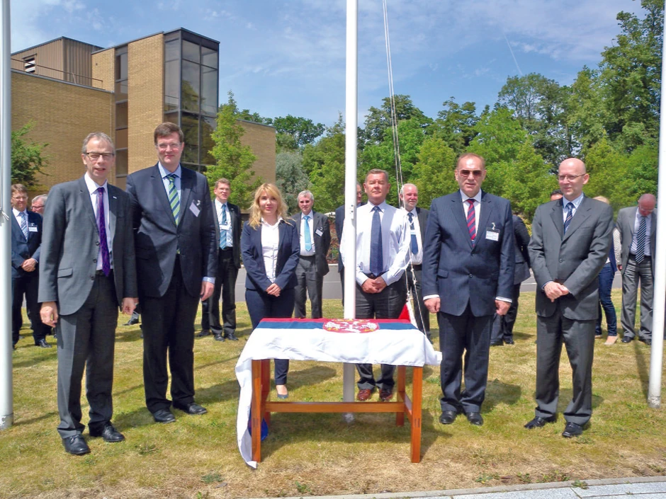 Zastavu je podigao profesor Jugoslav Nikolić, direktor Republičkog hidrometeorološkog zavoda (RHMZ) i predstavnik Republike Srbije u ECMWF, u prisustvu Ognjena Pribićevića, ambasadora Srbije u Londonu, profesora Alana Torpa, generalnog direktora ECMWF, Gerharda Adrijana, direktora nemačke meteorološke službe i predsedavajućeg Saveta ECMWF i ostalih dvadeset članova Saveta, predstavnika nacionalnih meteoroloških službi najrazvijenijih zemalja Evrope.