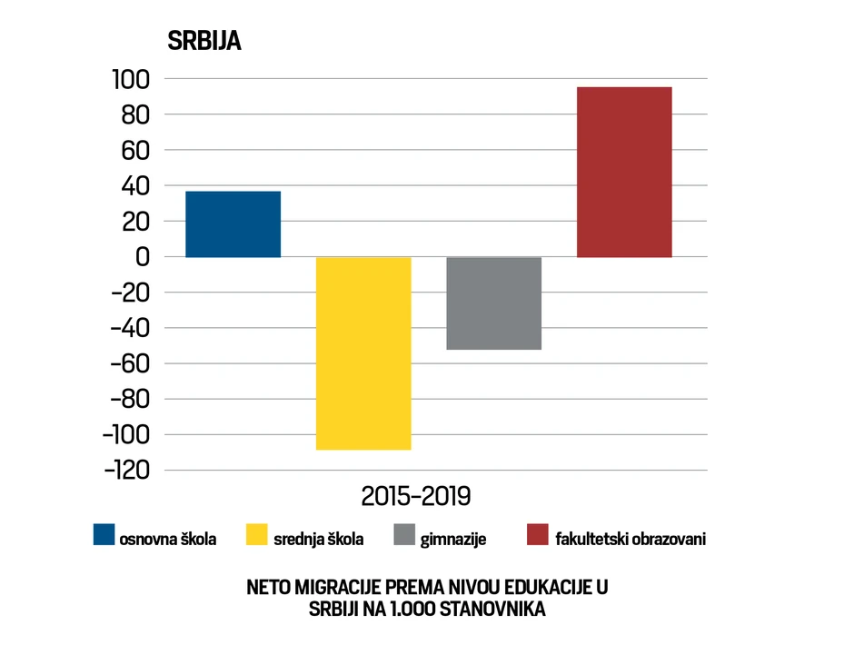Prema ovoj studiji koja je obuhvatila šest zemalja regiona, Srbija je u periodu od 2015. do 2019. godine na 1.000 kadrova sa fakultetskom diplomom dobila 90 novih! Ako se zna da u te četiri generacije ima 260.000 ljudi, to znači da smo dobili 23.400 novih, mladih, obrazovanih ljudi. Ova brojka predstavlja razliku između onih koji su došli u Srbiju i onih koji su je u istom tom periodu napustili.