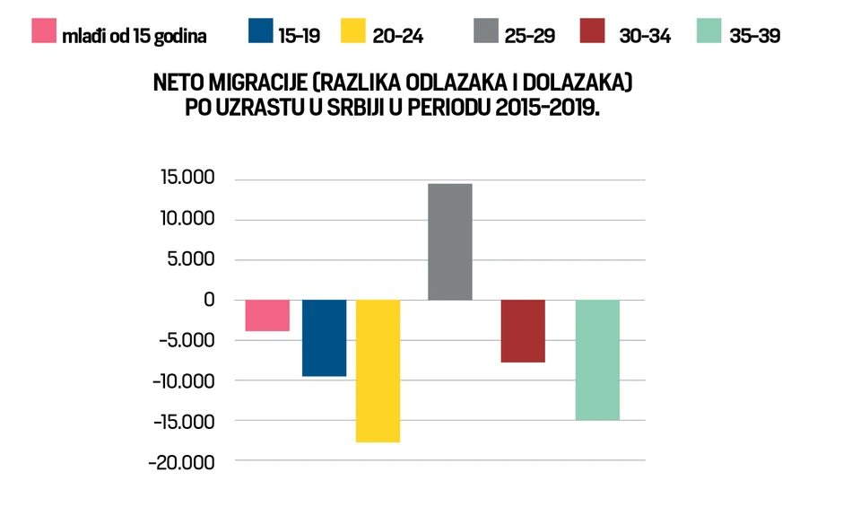 Zanimljiv je i pregled odlazaka mladih po starosnim kategorijama. Srbija je u periodu od 2015. do 2019. ostala bez 18.500 mladih u starosnom dobu između 20 i 24 godine. Toliko mladih u toj kategoriji je više otišlo iz zemlje, nego što je došlo u Srbiju. Lako je naslutiti da su to mladi koji odlaze u inostranstvo na studije. Sa druge strane, u istom tom periodu bogatiji smo za 15.000 mladih između 25. i 29. godine, dakle ljudi sa fakultetskom diplomom koji se vraćaju da žive u našoj zemlji. Istovremeno, kada je u pitanju stanovništvo između 30. i 39. godine, njih za četiri godine imamo manje za 22.500. To su uglavnom ljudi koji se odlučuju da svoja profesionalna znanja unovče u inostranstvo.