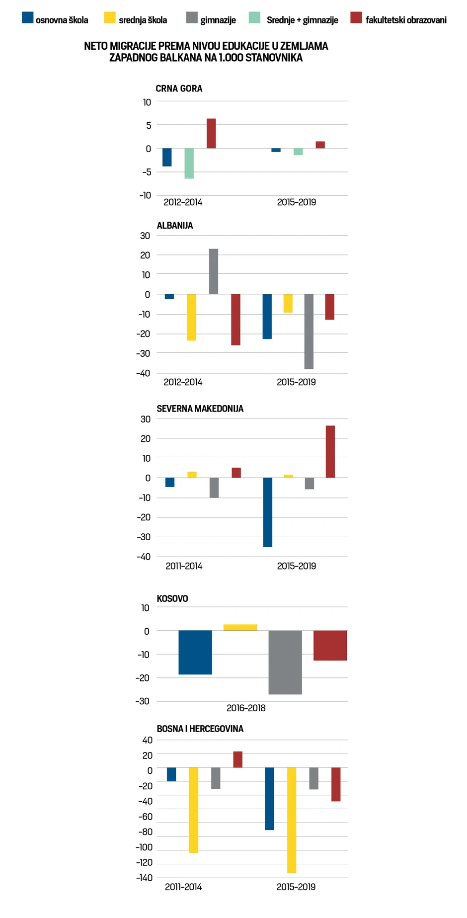 Situacija u drugim zemljama Zapadnog Balkana je dosta drugačija nego u Srbiji. Tendencije donekle slične Srbiji imaju Severna Makedonija i Crna Gore, jer je i u tim zemljama primetan povratak fakultetski obrazovanih mladih ljudi. Sa druge strane, u Bosni i Hercegovini, Albaniji i na Kosovu, migracije vode samo u jednom pravcu - iz tih zemalja (pogledajte grafike).