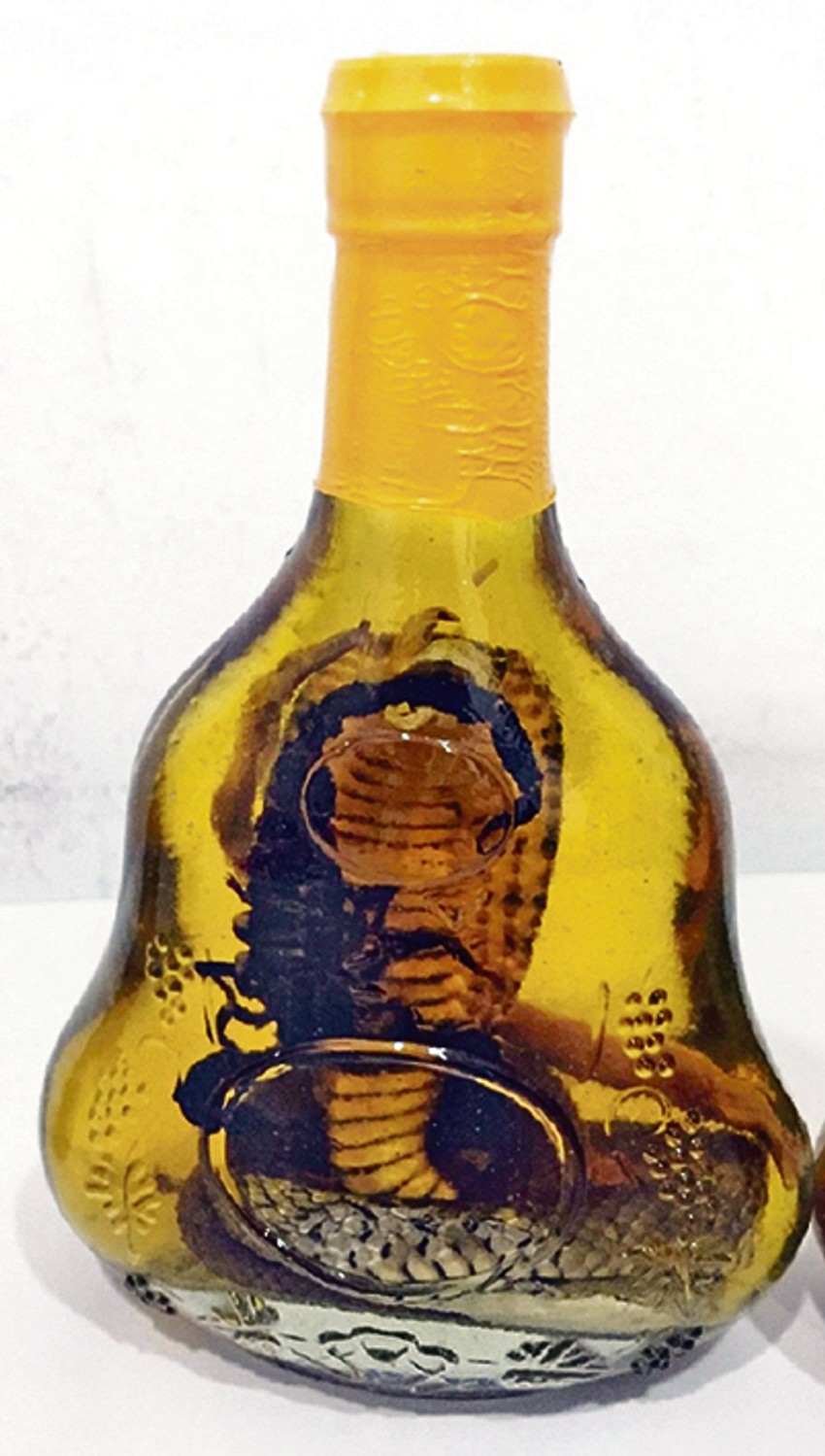 Četiri flaše iz Kambodže pune azijskog napitka u kojem je inače zmija sa škorpijom u čeljustima, a koristi se kao afrodizijak, zaplenjeno je kod dvojice Rumljana na Aerodromu „Nikola Tesla“.