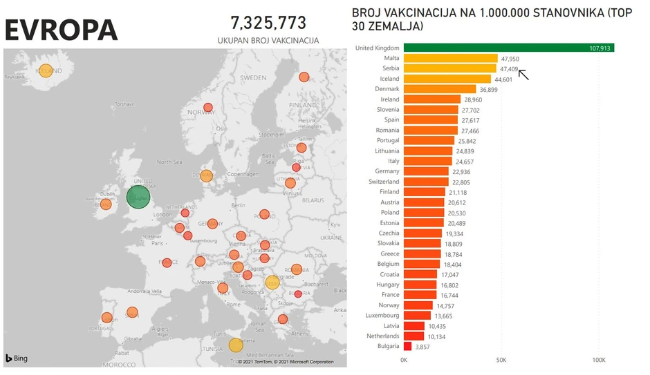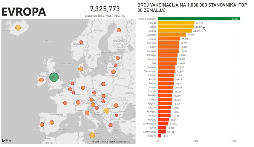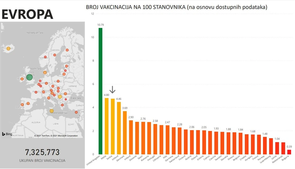 Kada je reč o broju vakcinacija na 100 stanovnika, Srbija je takođe na trećem mestu, posle Velike Britanije i Malte.