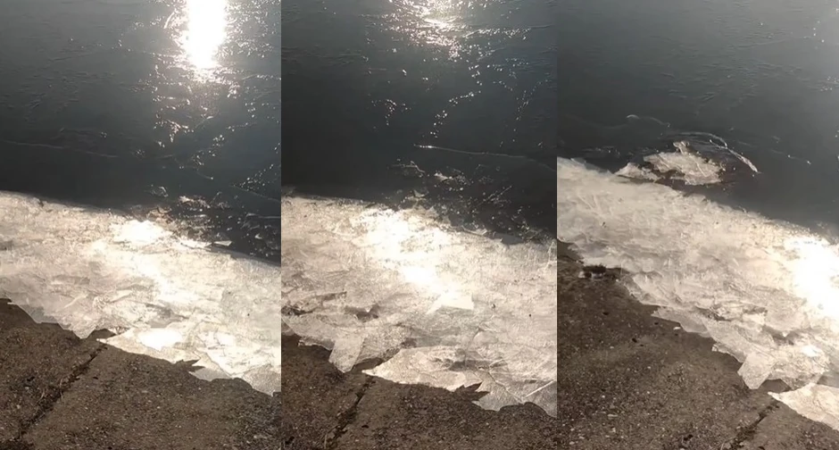 Na snimku se vidi led, čuje se kako krcka, a voda se talasa.