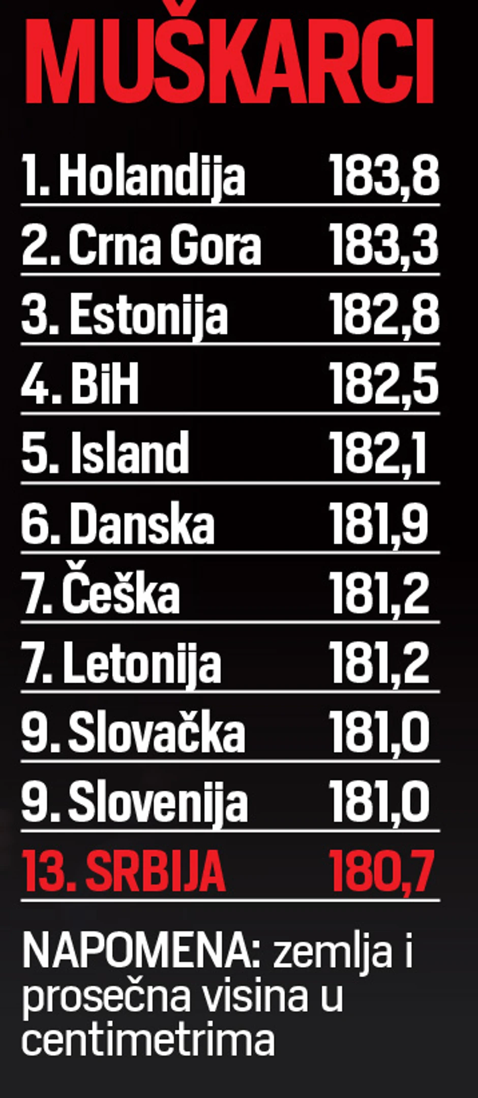 Da najviši ljudi žive u Evropi, i to u severnom i srednjem delu Starog kontinenta, potvrđuju i podaci o visini muškaraca gde su takođe na prvom mestu Holanđani sa prosečnih 183,8 centimetara, na drugom su Crnogorci (183,3), na trećem Estonci (182,8), a na četvrtom Bosanci (182,5).