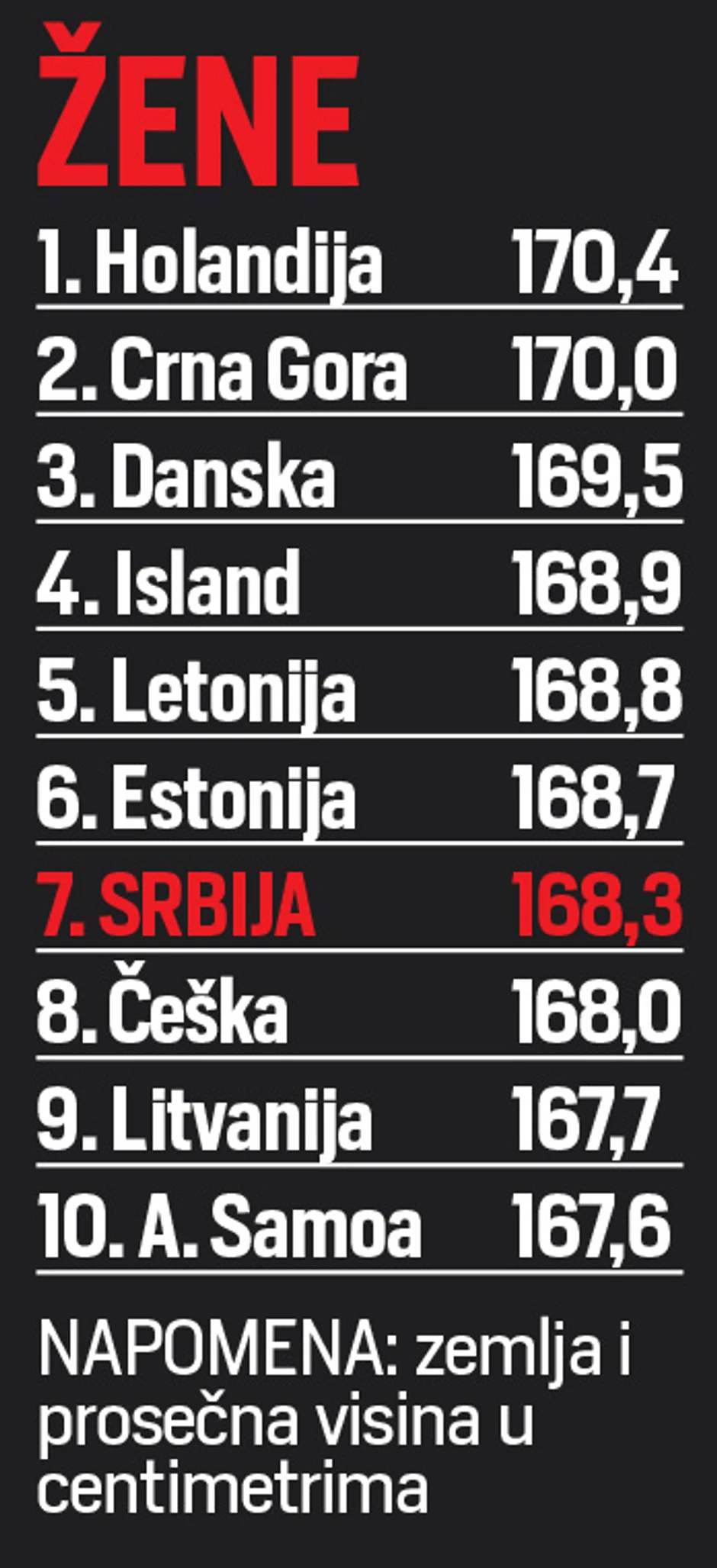 Prema ovim podacima, Srpkinje mogu da se pohvale da su se našle u top 10 i to na sedmom mestu sa prosekom od 168,3 centimetra, a ispred njih, osim Holanđanki, nalaze se još Crnogorke, Dankinje, Islanđanke, Letonke i Estonke.
