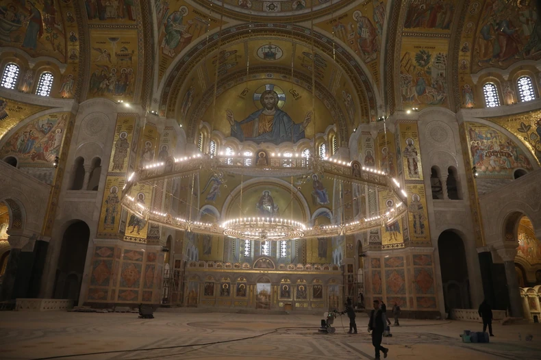 - Ta stvarnost su skoro 15.000 kvadratnih metara mozaika, u koji je ugrađeno preko 50 miliona komadića, težine veće od 320 tona. To su i figure, koje su impozantne. Hristos ima raspon ruku 17,2 metra, a njegova glava je preko četiri metra. U apsidi je i Bogorodica koja je replika, odnosno rađena po uzoru na ajasofijsku, s tim što sam ja rekao i hoću da ponovim, da je original koji je bio u Aja Sofiji, nekada otuđen i naknadno pronađen. On se čuva u Atini u muzeju i umetnik Muhin je s njega radio lik Bogorodice. Zato sam u šali rekao da je naša originalnija nego ona koja je u Aja Sofiji. Ali to nije šala, već fakat, kao što je fakat da je mozaik urađen po najnovijoj tehnici koja se u poslednjih 15 godina radi u Rusiji, za koju kažu da je rok trajanja, večnost - rekao je ranije vladika Stefan za "Blic"