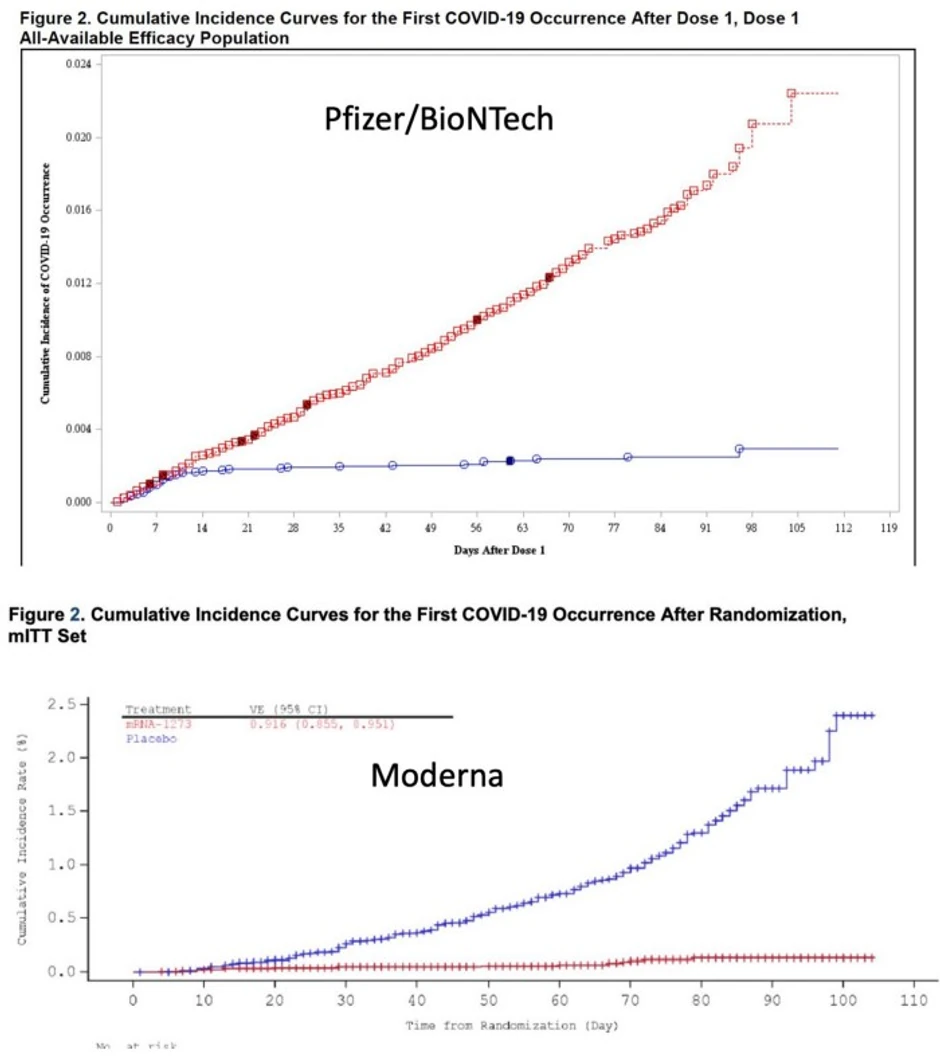 Znate onu staru: "Slika govori više od hiljadu reči"? Na slici ispod nalaze se rezultati kliničkih testiranja dve RNK vakcine, od dva različita proizvođača. Na grafikonima y osa prikazuje učestalost slučajeva korona virusa, dok x osa predstavlja dane nakon vakcinacije. Kod Pfizer/BioNTech grafikona crvenom linijom su predstavljeni nevakcinisani, a plavom oni vakcinisani. Učestalost slučajeva koronavirusa u vakcinisanoj populaciji opada otprilike 10 dana nakon vakcinacije".
