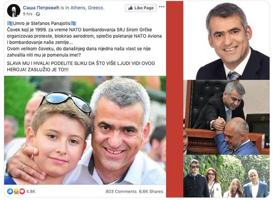 - Umro je Stefanos Panajotis. Čovek koji je 1999. za vreme NATO bombardovanja SRJ širom Grčke organizovao proteste, blokirao aerodrom, sprečio poletanje NATO aviona i bombardovanje naše zemlje... Ovom velikom čoveku, do današnjeg dana nijedna naša vlast se nije zahvalila niti mu je pomenula ime!? SLAVA MU I HVALA! PODELITE SLIKU DA ŠTO VIŠE LJUDI VIDI OVOG HEROJA! ZASLUŽIO JE TO!!! - objava je koju su sinoć korisnici drugih društvenih mreža mahnito delili, a uz koju se nalazila slika Vanđela Dule.