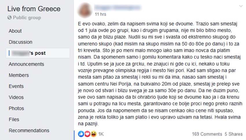 One je svoje iskustvo podelo sa članovima Fejsbuk grupe "Live from Greece", zbog svih onih koji se dvoume: