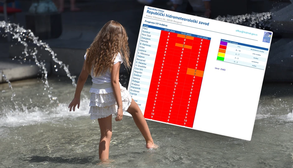 Cela Srbija danas je u crvenoj boji, tako je u svim gradovima na snazi veoma visok indeks od 8 do 10, sutra će jedino biti na Paliću i Zrenjaninu nešto niži, te će biti na snazi narandžasti meteo alarm vrednosti 7, dok ostatak zemlje ostaje crveno označen. U utorak se ništa drastično neće promeniti, te će samo u Smederevskoj palanci i u Beogradu biti 7, dok će u ostatku zemlje varirati od 8 do 10.