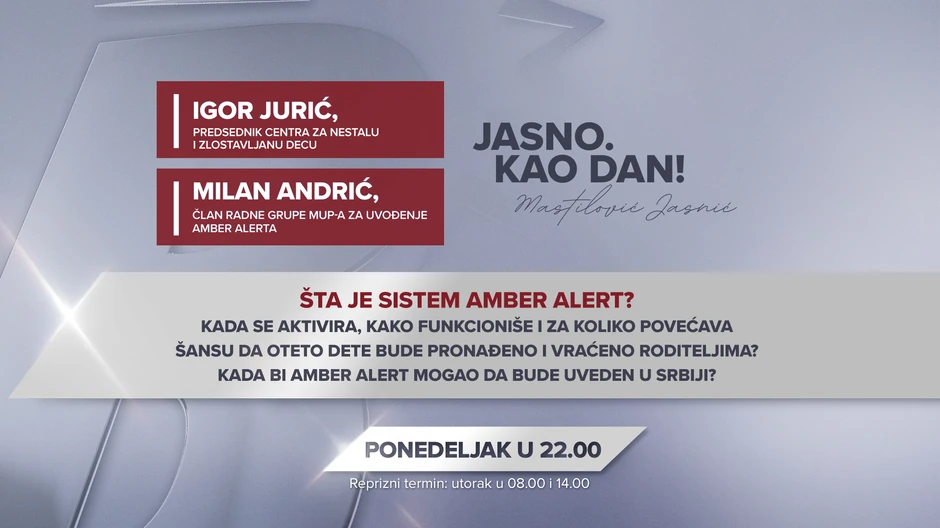 Gosti Ivane Mastilović Jasnić u emisiji "Jasno. Kao dan!" u ponedeljak u 22 sata na Blic televiziji biće Igor Jurić, predsednik Centra za nestalu i zlostavljanu decu i Milan Andrić, član Radne grupe MUP-a za uvođenje "Amber alerta".
