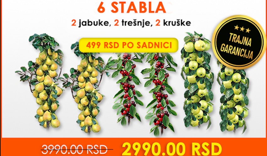 Posadite vaše stubaste sadnice koje zauzimaju malo prostora i idealne su za balkone, terase i male vrtove i bašte! Nabavite sadnice jabuke, kruške i trešnje već danas da biste mogli da počnete da berete voće što je pre moguće, i to za samo 1.990 dinara kikom na gruppi.rs. A ukoliko se odlučite za šest stabala, možete ih dobiti po hit ceni od 2.990 dinara!