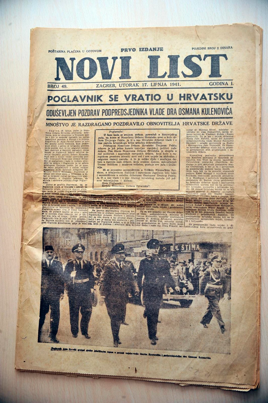 On nam pokazuje i retku enciklopediju iz NDH, zapisnike sa prvog zasedanja Hrvatskog državnog sabora iz 1942, novine “Hrvatska krajina” i “Novi list” sa naslovom “Poglavnik se vratio u Hrvatsku”...